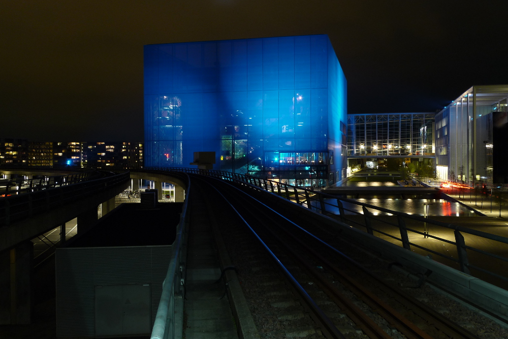 ”Maailman parhaaksi arkkitehtuuriksi”** en kyllä tätäkään taloa lähtisi nimittämään, vaikka syksyisessä öisessä maisemassa hehkuva sininen kuutio onkin kiistatta kaupunkikuvallisesti oivaltava ja konseptina hieno ratkaisu.