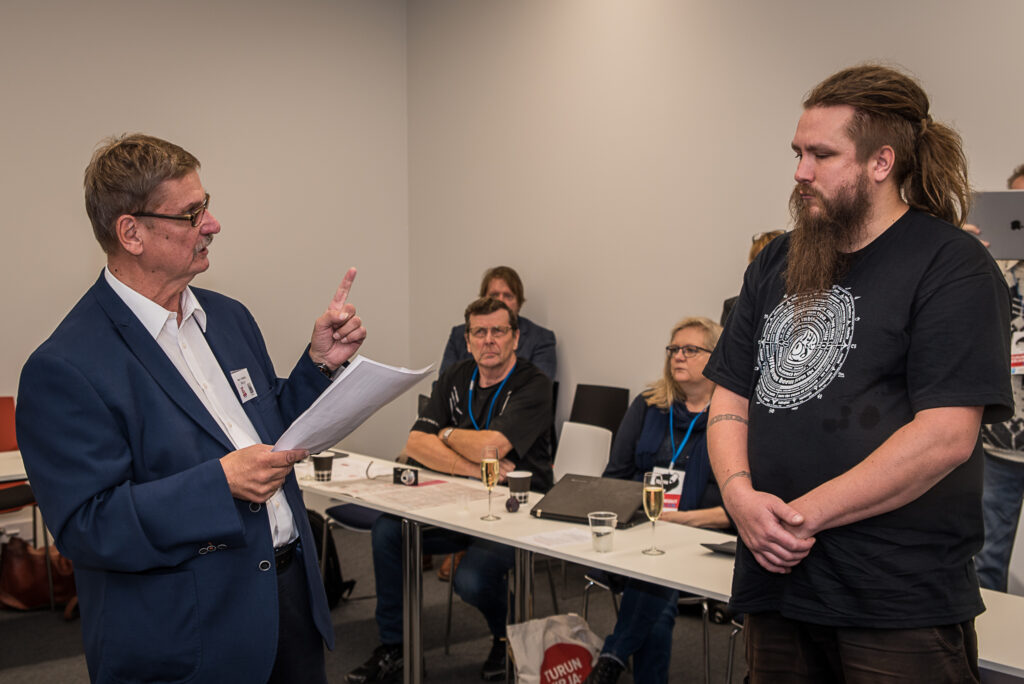 Turun osaston puheenjohtaja Kari J. Kettula lukee perusteluja ohjelmapäällikkö Paavo Vuoristolle (TVO). Kuva: Harri Sundell