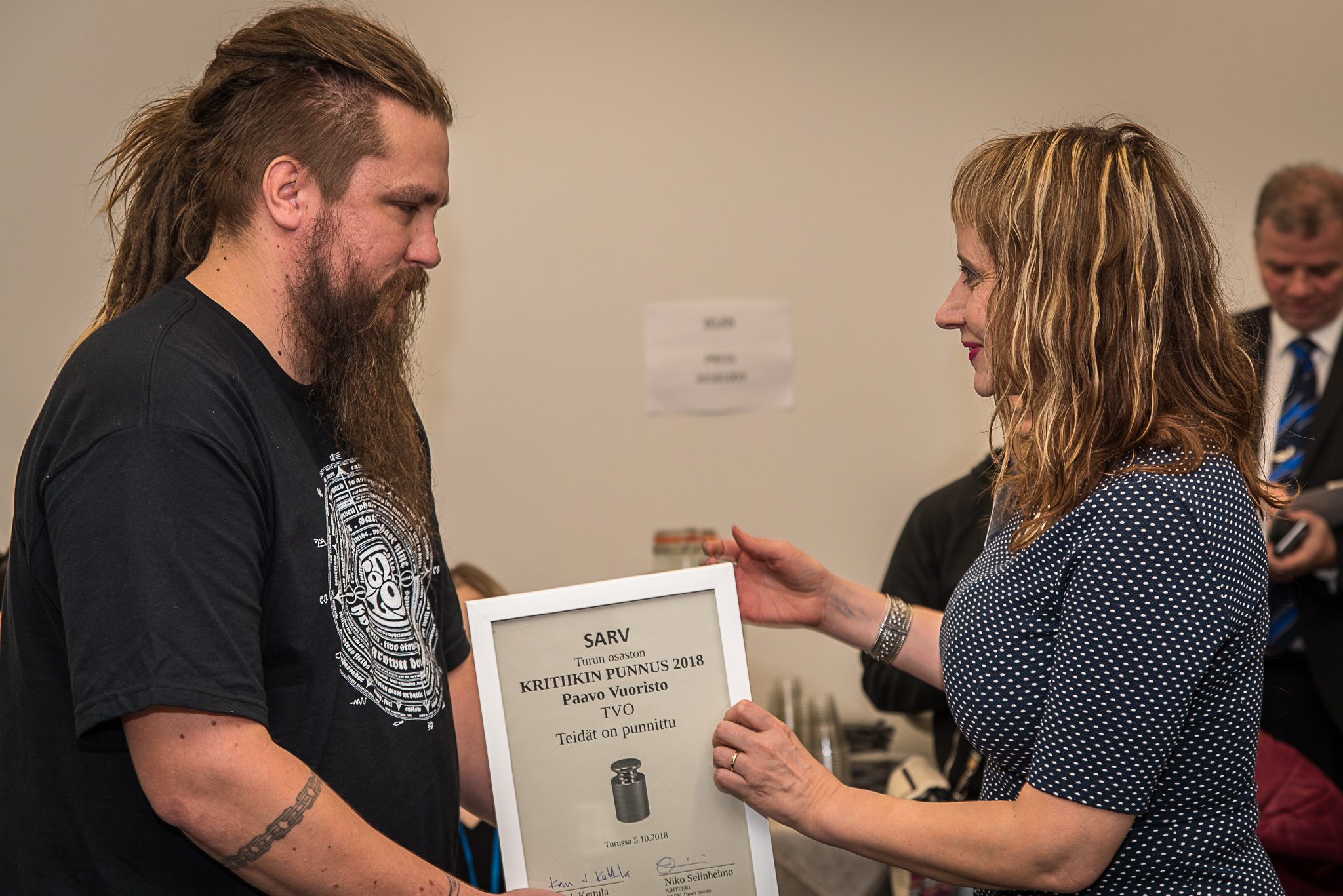 Paavo Vuoristo saa palkinnon toiminnanjohtaja Riikka Laczakilta. Kuva: Harri Sundell