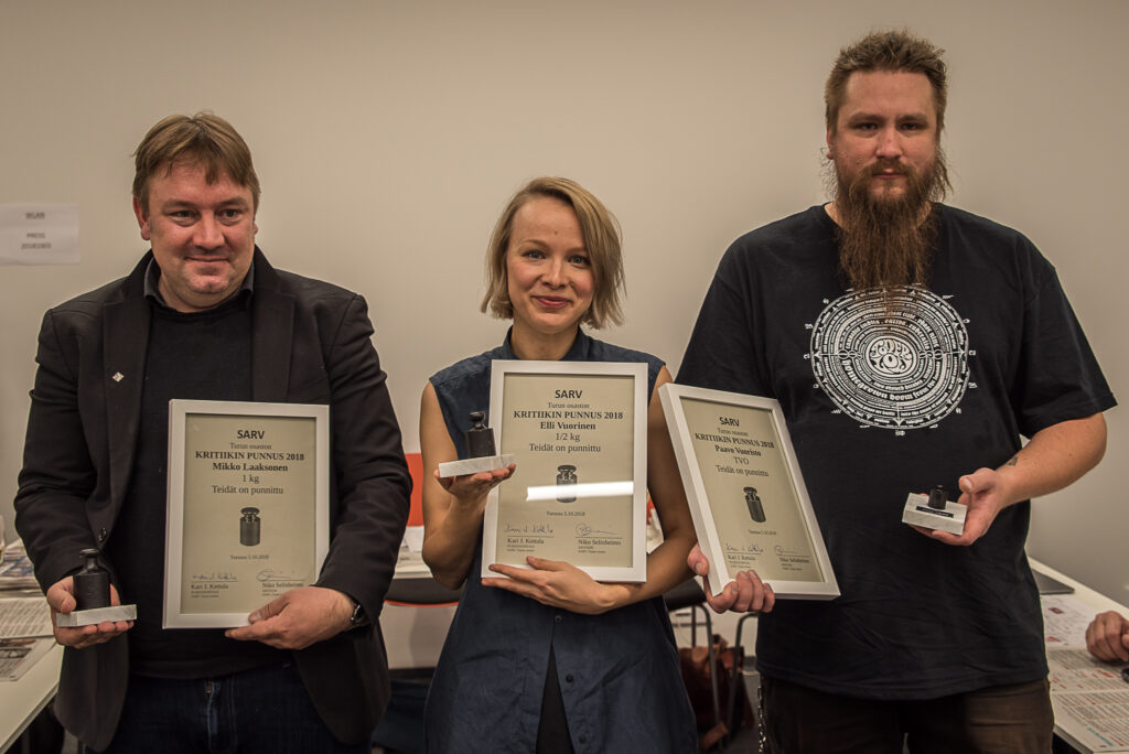 Suomen arvostelijain liiton Turun osasto myönsi juhlavuoden Kritiikin punnukset Turun Kirjamessuilla 5.10.2018 tietokirjailija Mikko Laaksoselle, elokuvaohjaaja Elli Vuoriselle ja ohjelmapäällikkö Paavo Vuoristolle (TVO). Palkinto jaettiin 40. kerran.