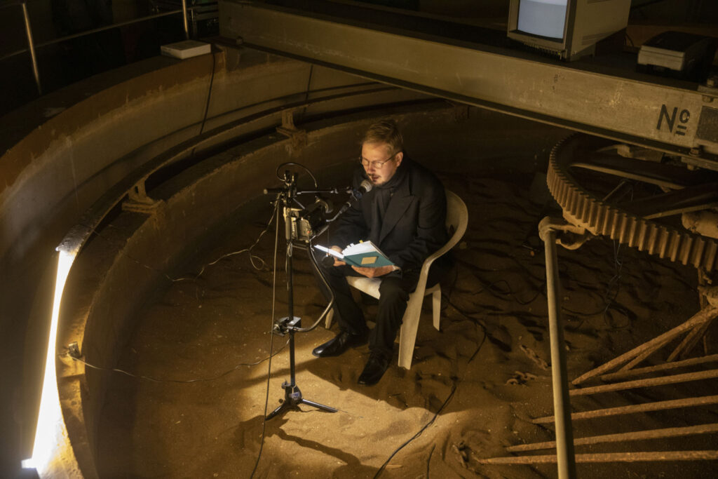 Esiintyjä Eino Santanen post-immersiivisessä tilassa? Valtteri Raekallion Yleisö (2018). Kuva: Stefan Bremer