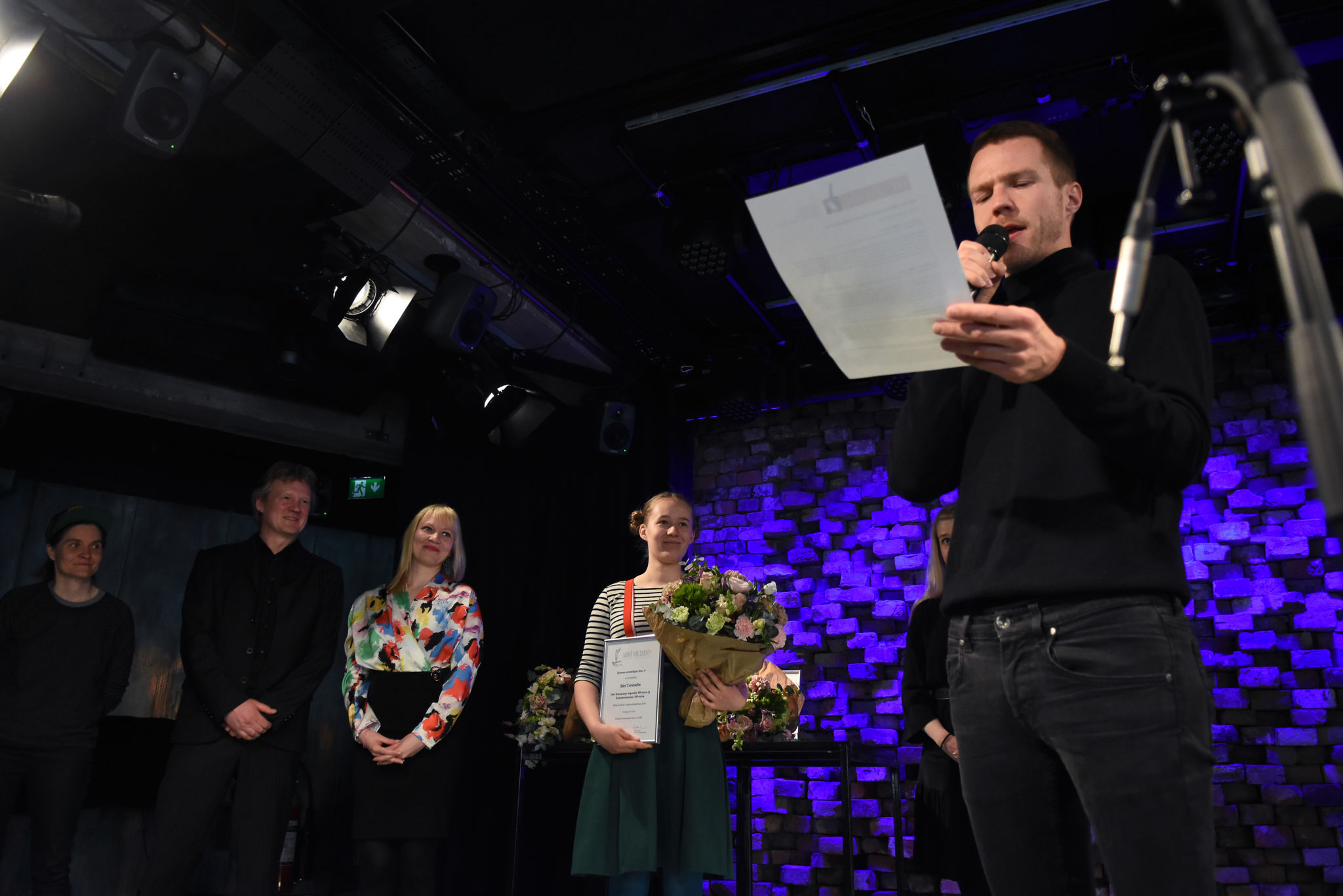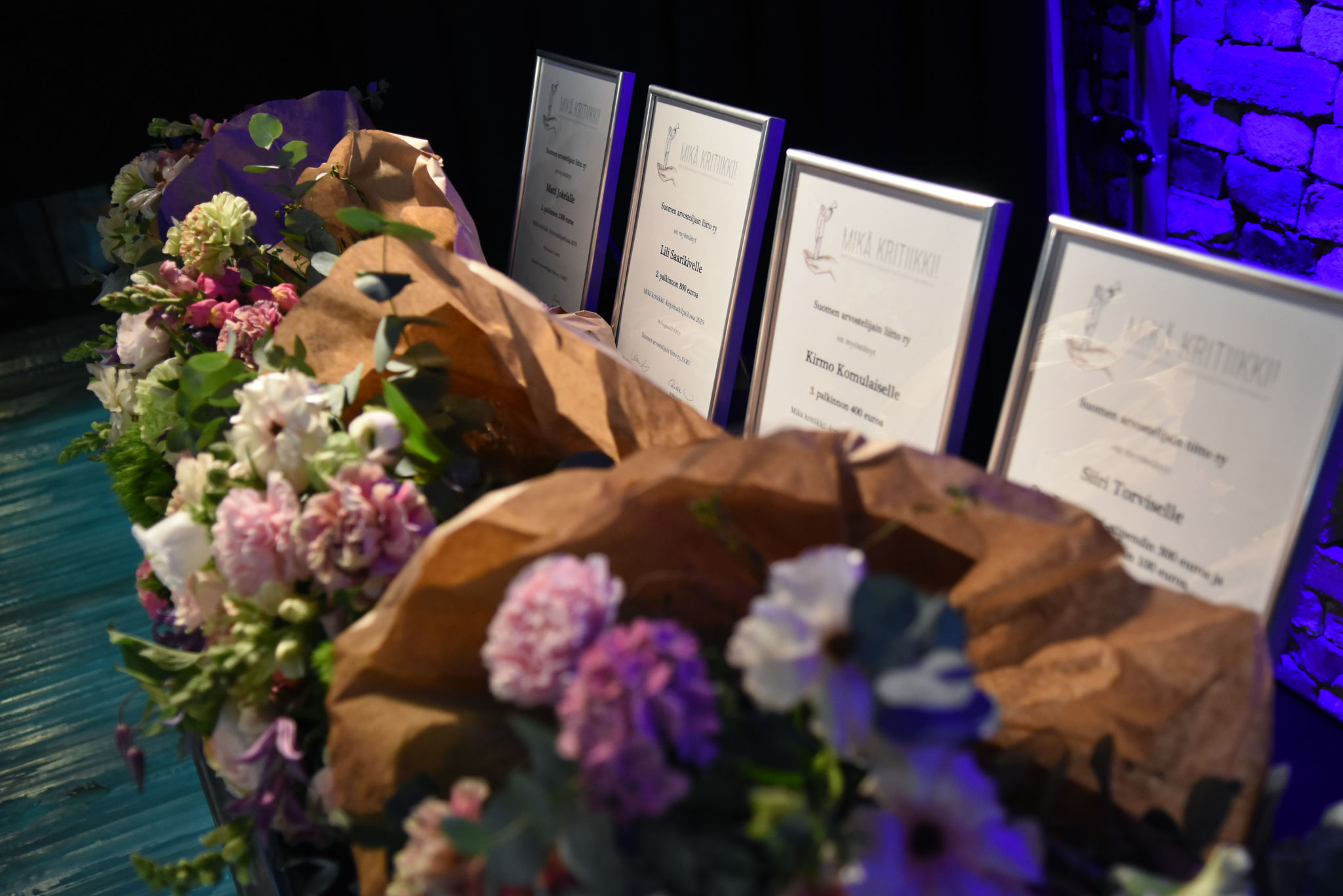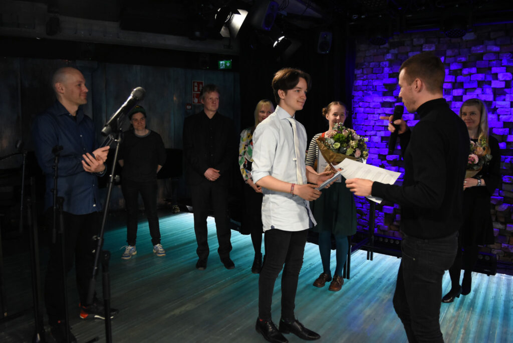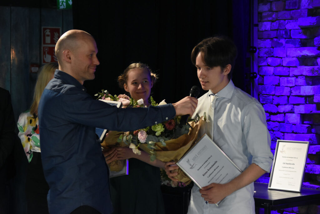 Aleksis Salusjärvi, Pauliina Feodoroff, Taina Latvala ja Martti-Tapio Kuuskoski. Kuva: Jouni ViitalaKukat ja kunniakirjat. Kuva: Jouni ViitalaKilpailun suojelijana toimi muusikko ja näyttelijä Olavi Uusivirta, joka jakoi palkinnot ja luki palkintoperustelut. Kuva: Jouni ViitalaOtso Kantokorpi -stipendi ja tuomariston kunniamaininta myönnettiin Siiri Torviselle metakritiikistä Absurdi kritiikki itse itsestään. Kuva: Jouni ViitalaKilpailussa kolmannen palkinnon sai Kirmo Komulainen arviosta Loputon joki – kritiikki elokuvasta Call Me By Your Name. Kuva: Jouni ViitalaKirmo Komulainen Aleksis Salusjärven haastateltavana. Kuva: Jouni ViitalaKirjoituskilpailun toinen palkinto myönnettiin Lili Saarikivelle Kuin maailma hengittäisi -arviosta. Kuva: Jouni ViitalaKilpailun ensimmäisen palkinnon sai Matti Jokela arviostaan En postmodern kritik av musikkritik. Kuva: Jouni ViitalaSuojelija Olavi Uusivirta. Kuva: Jouni ViitalaPalkitut Siiri Torvinen, Kirmo Komulainen, Lili Saarikivi ja Matti Jokela. Kuva: Jouni ViitalaTilaisuuden yleisöä. Kuva: Jouni ViitalaKilpailun suojelija Olavi Uusivirta esiintyi tilaisuudessa. Kuva: Jouni ViitalaOlavi Uusivirta esiintymässä Mikä kritiikki! -kirjoituskilpailun palkintojenjakotilaisuudessa G Livelabissa. Kuva: Jouni ViitalaOnnittelumalja Siiri Torvisen perheen kanssa. Kuva: Jouni ViitalaKriitikko Kikka Holmberg sekä palkitut Kirmo Komulainen ja Siiri Torvinen. Kuva: Jouni ViitalaTaina Latvala, Olavi Uusivirta, Petra Forsten ja Martti-Tapio Kuuskoski. Kuva: Jouni ViitalaPalkittu Kirmo Komulainen ja tilaisuuden yleisöä. Kuva: Jouni ViitalaTarjolla oli kuohuvaa ja nuorille sopivaa juhlajuomaa. Kuva: Jouni Viitala