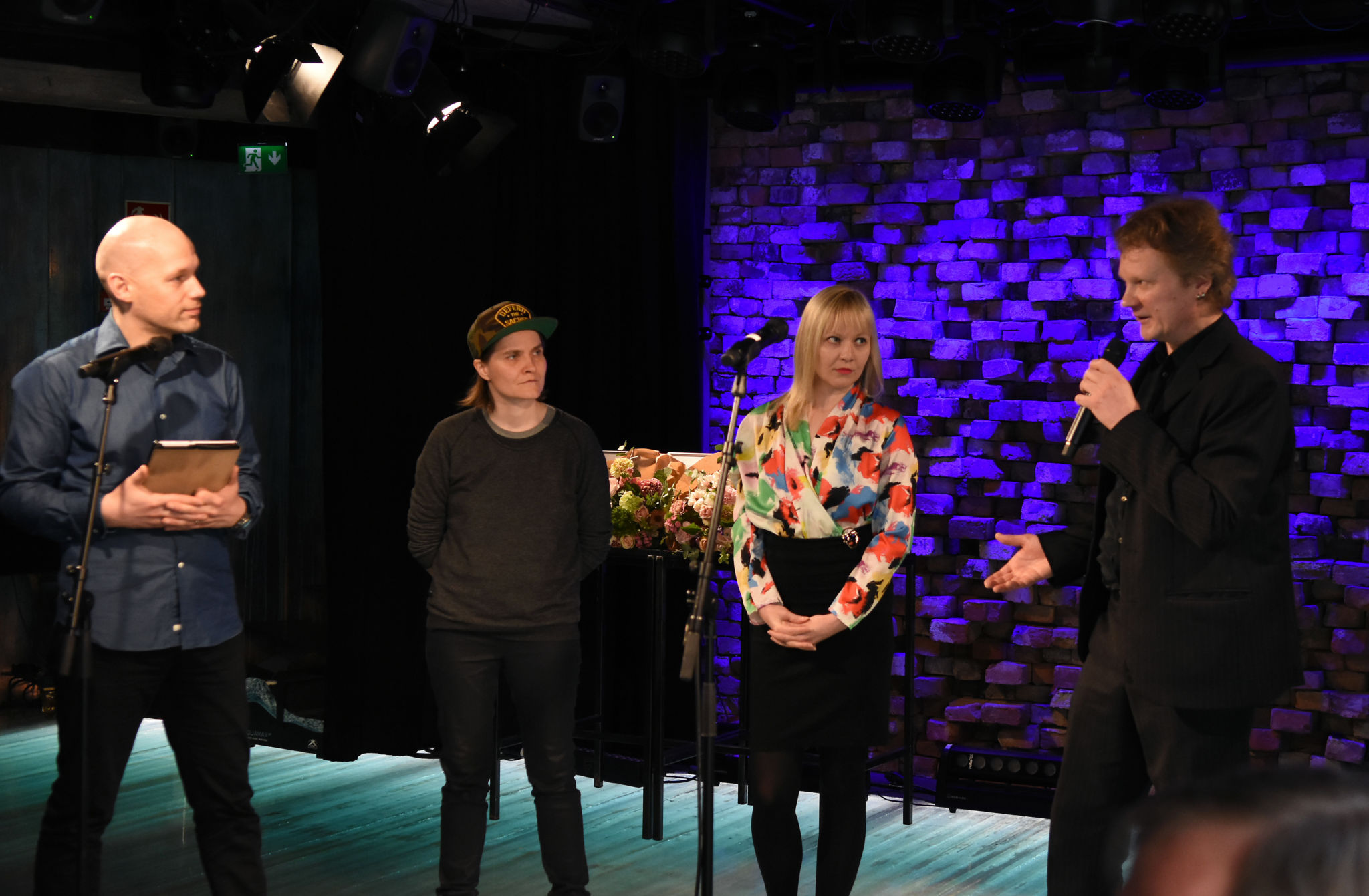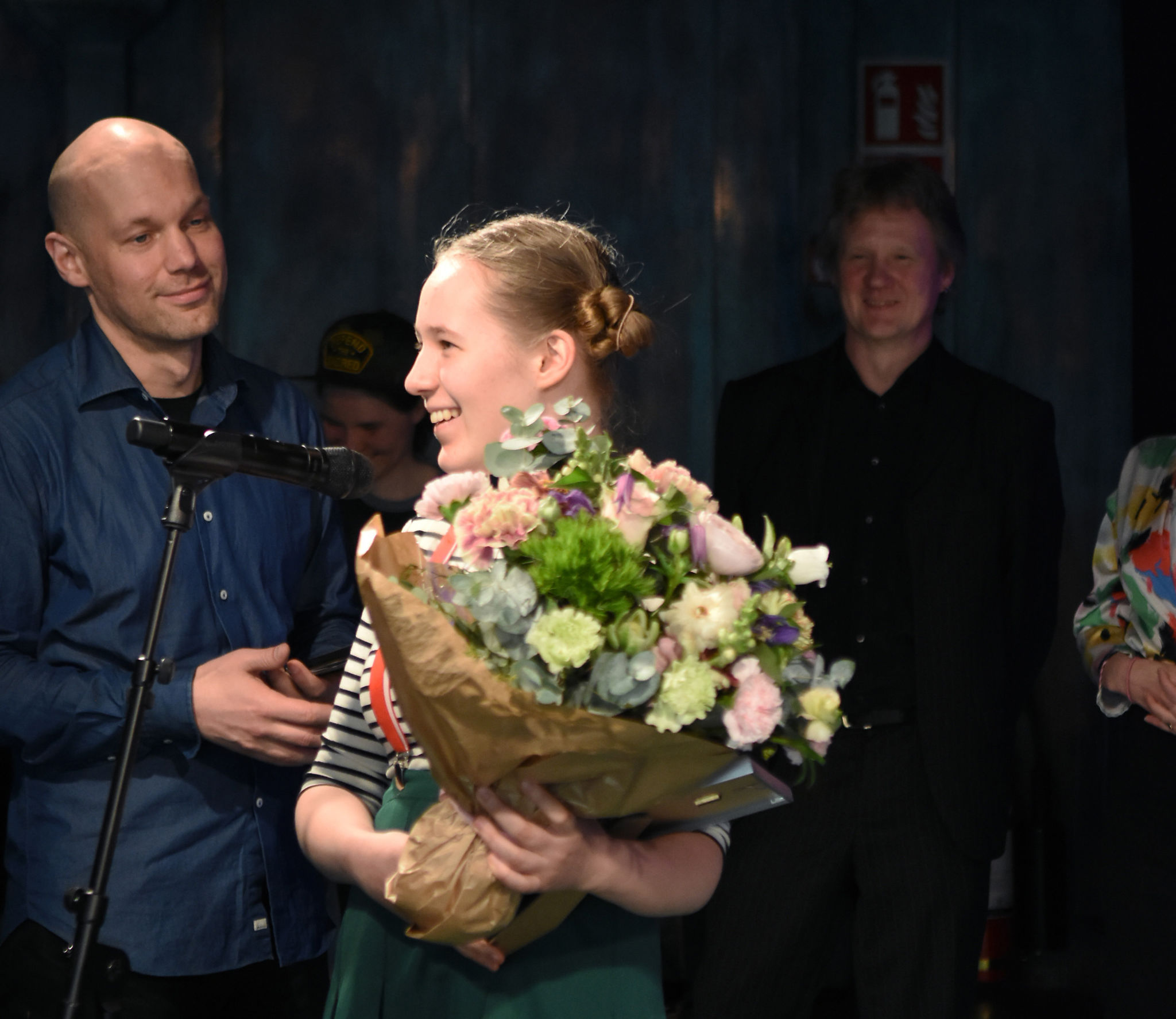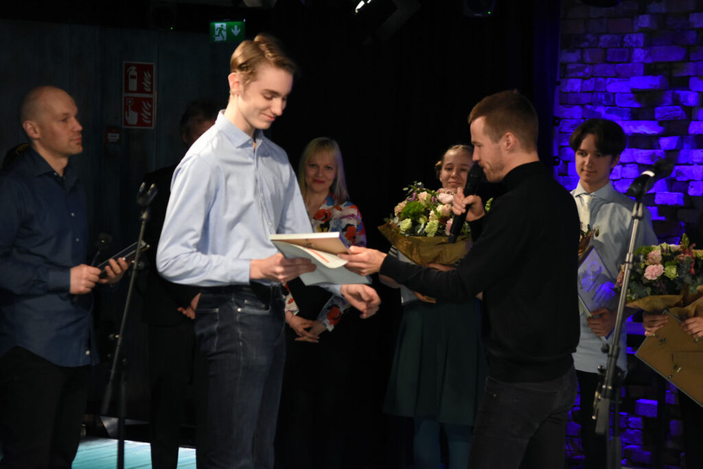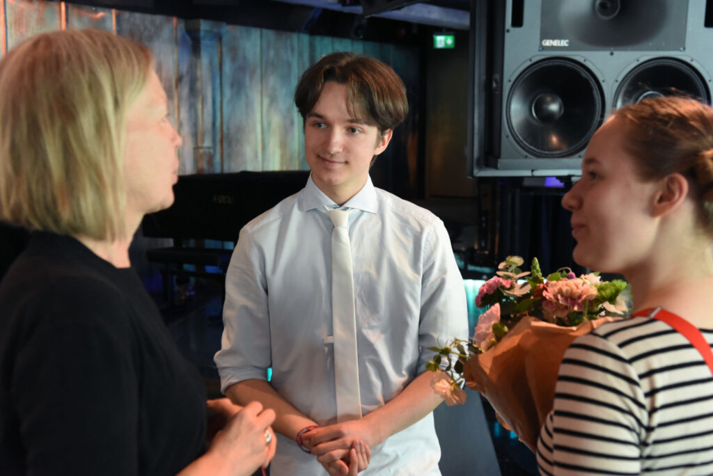Aleksis Salusjärvi, Pauliina Feodoroff, Taina Latvala ja Martti-Tapio Kuuskoski. Kuva: Jouni ViitalaKukat ja kunniakirjat. Kuva: Jouni ViitalaKilpailun suojelijana toimi muusikko ja näyttelijä Olavi Uusivirta, joka jakoi palkinnot ja luki palkintoperustelut. Kuva: Jouni ViitalaOtso Kantokorpi -stipendi ja tuomariston kunniamaininta myönnettiin Siiri Torviselle metakritiikistä Absurdi kritiikki itse itsestään. Kuva: Jouni ViitalaKilpailussa kolmannen palkinnon sai Kirmo Komulainen arviosta Loputon joki – kritiikki elokuvasta Call Me By Your Name. Kuva: Jouni ViitalaKirmo Komulainen Aleksis Salusjärven haastateltavana. Kuva: Jouni ViitalaKirjoituskilpailun toinen palkinto myönnettiin Lili Saarikivelle Kuin maailma hengittäisi -arviosta. Kuva: Jouni ViitalaKilpailun ensimmäisen palkinnon sai Matti Jokela arviostaan En postmodern kritik av musikkritik. Kuva: Jouni ViitalaSuojelija Olavi Uusivirta. Kuva: Jouni ViitalaPalkitut Siiri Torvinen, Kirmo Komulainen, Lili Saarikivi ja Matti Jokela. Kuva: Jouni ViitalaTilaisuuden yleisöä. Kuva: Jouni ViitalaKilpailun suojelija Olavi Uusivirta esiintyi tilaisuudessa. Kuva: Jouni ViitalaOlavi Uusivirta esiintymässä Mikä kritiikki! -kirjoituskilpailun palkintojenjakotilaisuudessa G Livelabissa. Kuva: Jouni ViitalaOnnittelumalja Siiri Torvisen perheen kanssa. Kuva: Jouni ViitalaKriitikko Kikka Holmberg sekä palkitut Kirmo Komulainen ja Siiri Torvinen. Kuva: Jouni ViitalaTaina Latvala, Olavi Uusivirta, Petra Forsten ja Martti-Tapio Kuuskoski. Kuva: Jouni ViitalaPalkittu Kirmo Komulainen ja tilaisuuden yleisöä. Kuva: Jouni ViitalaTarjolla oli kuohuvaa ja nuorille sopivaa juhlajuomaa. Kuva: Jouni Viitala