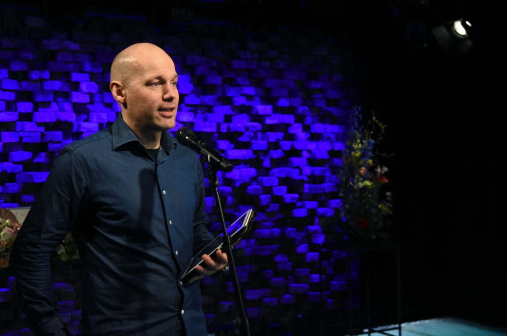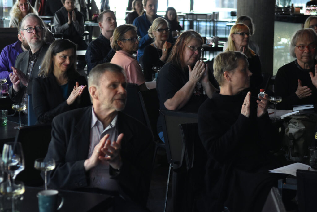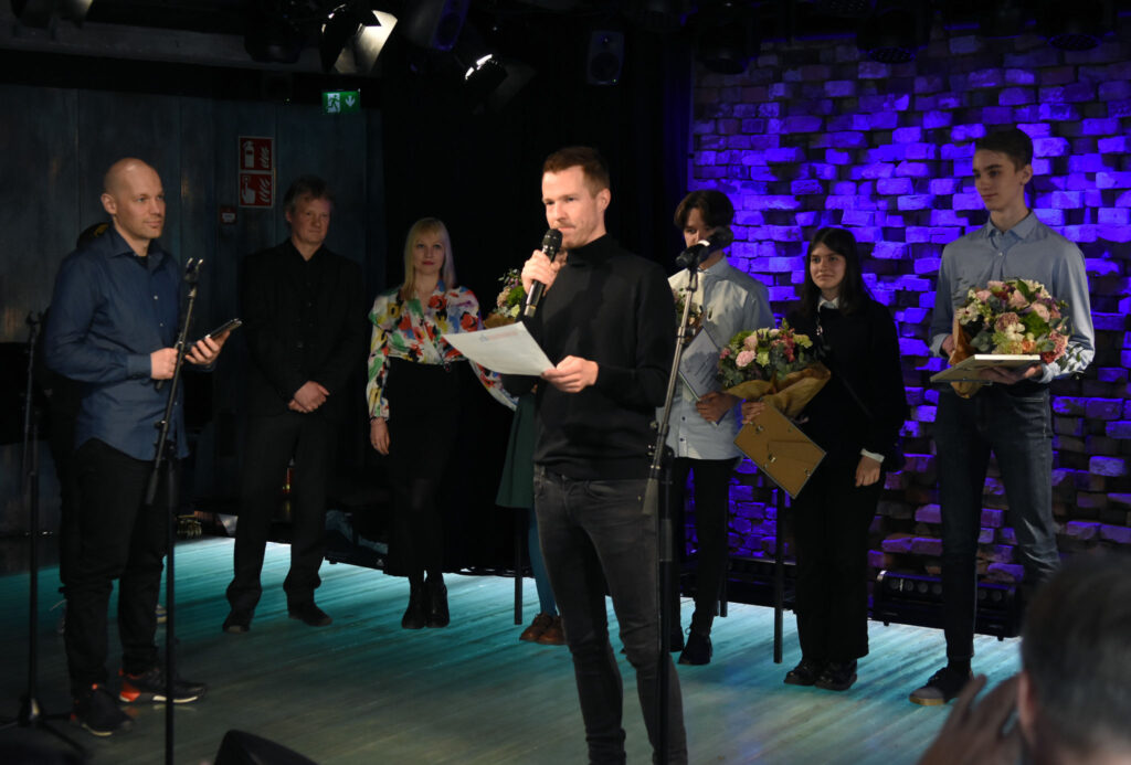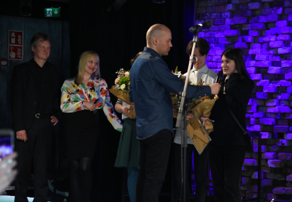 Tilaisuuden juonsi Kiiltomato-verkkolehden päätoimittaja Aleksis Salusjärvi. Kuva: Jouni ViitalaAvaussanat lausui SARVin puheenjohtaja Maria Säkö. Kuva: Jouni ViitalaFinlandia Junior -palkittu kirjailija Vilja-Tuulia Huotarinen piti juhlapuheenvuoron otsikolla Keskeneräisyyden merkitys. Kuva: Jouni Viitala