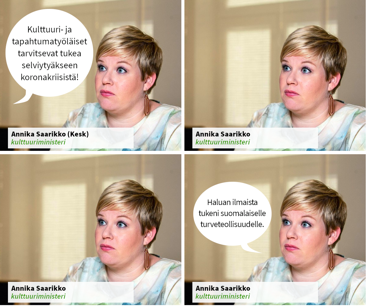 Kriittisten katseiden ristitulessa on nyt kulttuuriministeri ja keskustan puheenjohtaja Annika Saarikko. Häneltä on odotettu paljon, mutta on koettu, että on saatu vähän, jos mitään. Tyytymättömiä on runsaasti, kuten koronarajoitusten takia toimeentulonsa lähes tai täysin menettäneet kulttuuri- ja erityisesti suunnattoman suuren tapahtuma-alan toimijoiden, varsinkin freelancereiden joukko, sekä kulttuurinnälkäinen konsertti-, teatteri- ja taideyleisö.