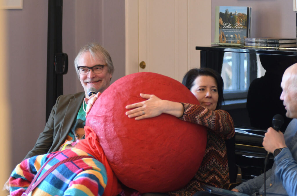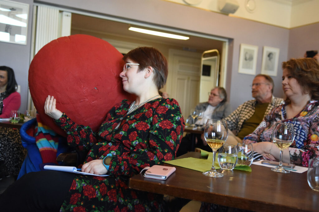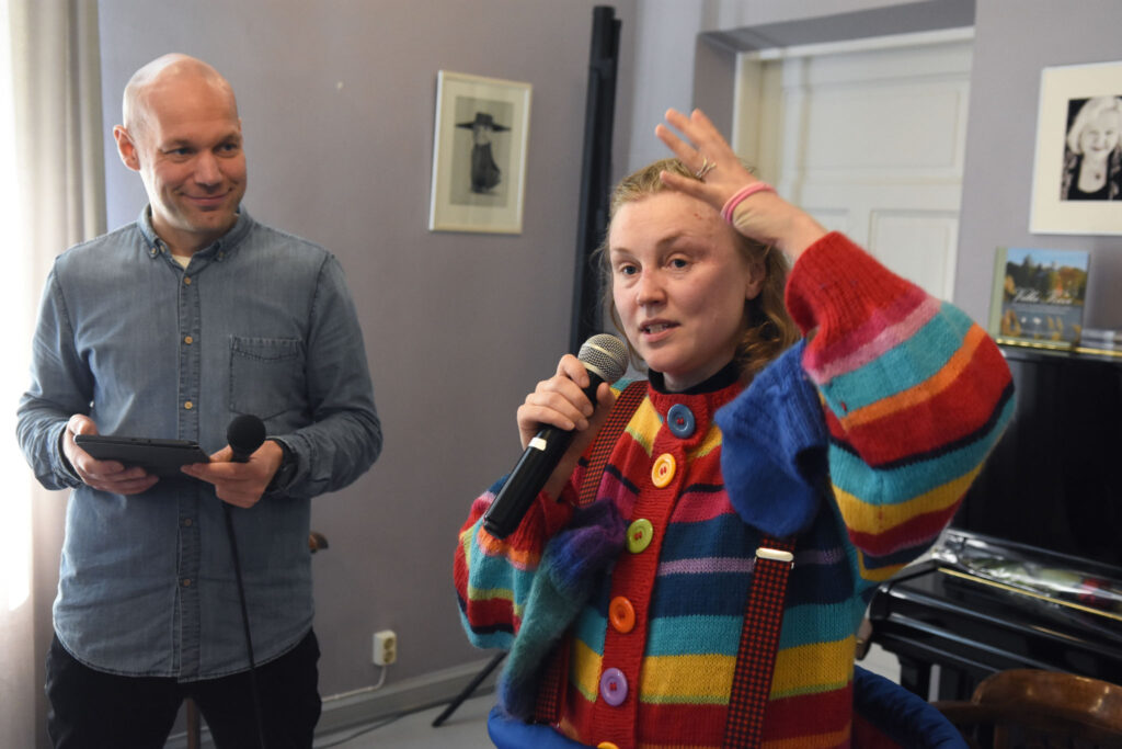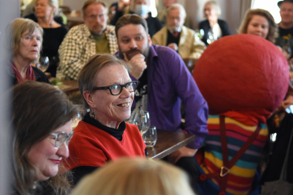 Tilaisuuden juonsi kritiikko, kulttuuritoimittaja Aleksis Salusjärvi. Kuva: Jouni ViitalaMiten tehdään lähikritiikkiä? Miltä näyttää kulttuurijournalismin ja kritiikin tilanne eri puolilla Suomea? Keskustelijoina olivat Keskipohjanmaan alueella toimiva freelance-kriitikko Hannu Björkbacka ja Suomen Journalistiliiton puheenjohtaja Hanne Aho. Keskustelun veti Aleksis Salusjärvi. Kuva: Jouni ViitalaIsonenä-hahmo ja Journalistiliiton puheenjohtaja Hanne Aho keskustelussa. Kuva: Jouni ViitalaKlovni lepuutti hetken isoa punaista nenäänsä musiikkikriitikko Tove Djupsjöbackan olkapäällä. Kuva: Jouni ViitalaTilaisuudessa oli runsaasti yleisöä ja vilkasta keskustelua. Kriitikko Marja-Terttu Kivirinnan puheenvuoro. Kuva: Jouni ViitalaMiten kirjoittaa taiteen kanssa? Esitystaiteilija ja -tutkija Pilvi Porkola sekä kriitikko ja nykytaiteen tutkija Mia Hannula keskustelivat taiteen ja kritiikin suhteesta. Molemmat olivat myös kirjoittaneet Kritiikki näkyy! -julkaisuun. Keskustelun veti projektikoordinaattori Maaria Ylikangas. Kuva: Jouni ViitalaKriitikko ja nykytaiteen tutkija Mia Hannula on seurannut Kritiikki näkyy! -hanketta koko sen keston ajan. Kuva: Jouni ViitalaTilaisuuden lopuksi kuultiin Kritiikki näkyy! -hankkeen jälkisanat, kukitettiin kirjan tekijöitä ja Aleksis Salusjärvi haastatteli näyttelijä Laura Rämää Isonenä-performanssista. Kuva: Jouni ViitalaHerkullisista tarjoiluista vastasi Share Catering. Kuva: Jouni Viitala