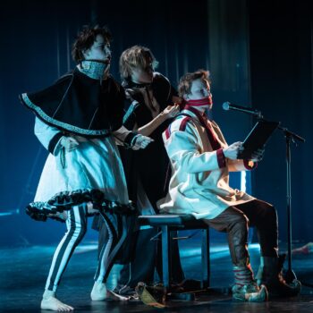 Keskellä näyttämöä Juovssaheaddji (Niillas Holmberg), jonka takana Goavddis[1] (Jakop Janssønn) ja vierellä Ruđot[2] (Gáddjá Haarla Pieski ja Biret Haarla Pieski).