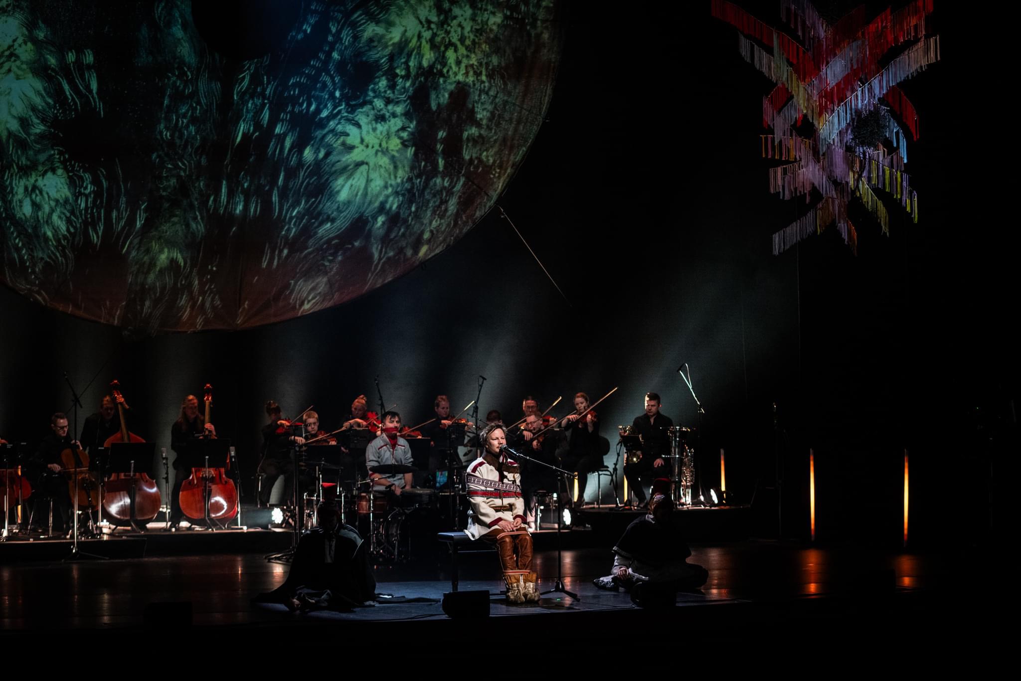 Keskellä näyttämöä Juovssaheaddji (Niillas Holmberg), jonka takana Goavddis[1] (Jakop Janssønn) ja vierellä Ruđot[2] (Gáddjá Haarla Pieski ja Biret Haarla Pieski).