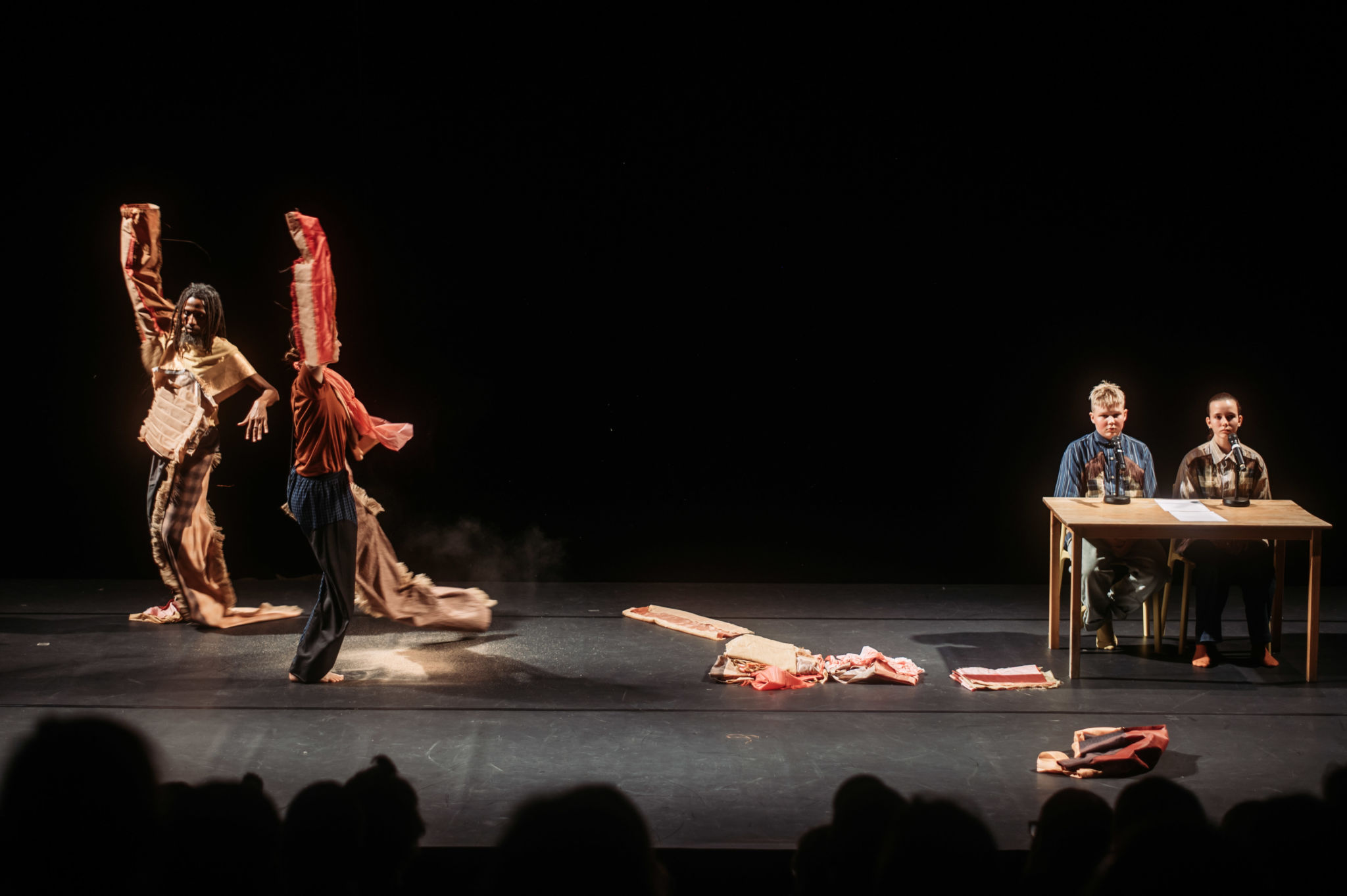 Everything you see and hear, even if clearly articulated, changes. Everything is in movement and in relation to it… and that relationship changes. The flow takes care of it, wind, motion. Walking by becomes stepping, then stamping and dancing until standing, then whirling, and sitting. Then a little bit of swaying. Who does it? A human but a bird. A bird but a handkerchief, a yellow glove, and yellow chairs with two legs directly but two legs indirectly on the floor, six hands and two red cones. There are humans, their bodies, each different, dressed in soft, colourful fabrics. These fabrics are in fragments, dressing only parts of the bodies. Trousers, scarf-somethings, loose sleeves, and an extension. These limbs seem fragmented then, animated, framed, cut out, mending and un-mending those bodies other-wise. I am caught in between this necessary, unavoidable poetry, since what is unfolding is not conceivable, sharable, speakable in any other form. All this is useful and not useful, functional and dysfunctional, and it all flows, moves, changes. The bodies on stage mutate while doing, others follow while watching, listening. The wind becomes a breath, and a breath changes into sound; is it the wind playing? It is not “what is it?” but rather “how is it?” … It is generative, rounded; simple and difficult, where words are disconnected but elevated; pompous but simple; humble and grandiose at the same time.