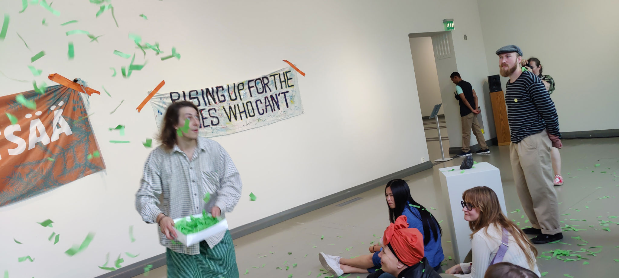 It is an “audience member” that haunts the festival. And even if I am here, I am not it. This ghost of an audience is something else, it is a motherf**ker of a double-edged sword. For the audience member to exist, the performance must happen; and for the performance to happen, some audience must witness it. I imagine that for the festival to happen, a certain number of audiences must happen, and the festival produces its own audience. Luckily in this festival, Tuomas Laitinen’s performance Audience Body can bring the ghost back to its corporeal existence. It emerges together with the emergence of the performance, and the two hold each other in a kind of threshold lock. What if the audience is a charge between being in and out? As this work is also a part of the author’s artistic research, the performance of the Audience Body is formulated as a critical question. The sound of the audience is dispersed, the body of the audience is humming like bees, the audience is dispersed and yet contained within the installation of performing textual objects, letters, books, cards with scores. They activate “us”. The audience presents itself as a mobile and active, interconnected composition of bodies, voices, watching, seeing, reading, sounds of turning paper, quiet walking, sitting, standing. The audience body is somehow of low volume even if silence is not required. The audience body is here is very careful not to break the illusion of its own existence as this is a sacred ritual. Does realising one’s own potential leave one in awe? In awe of simply being, making an appearance, reading the written word about oneself, or in awe of emerging as an event? There is a magic in the reciprocal back and forth of allowing things to happen, turning papers, and reading on about what is occurring. In awe of their own existence, the audience coughs softly, chats softly, watches slightly, moves not too dramatically, smiles politely, and people give each other space. There is a distant kindness in this mutual recognition and care as we are moving in and out, in and out, between the performance and audience modes. The balance seems to be fragile; the performance is strong, yet the author seems even stronger, intimate, close, insisting on “us”, whatever “we” do. Whatever?