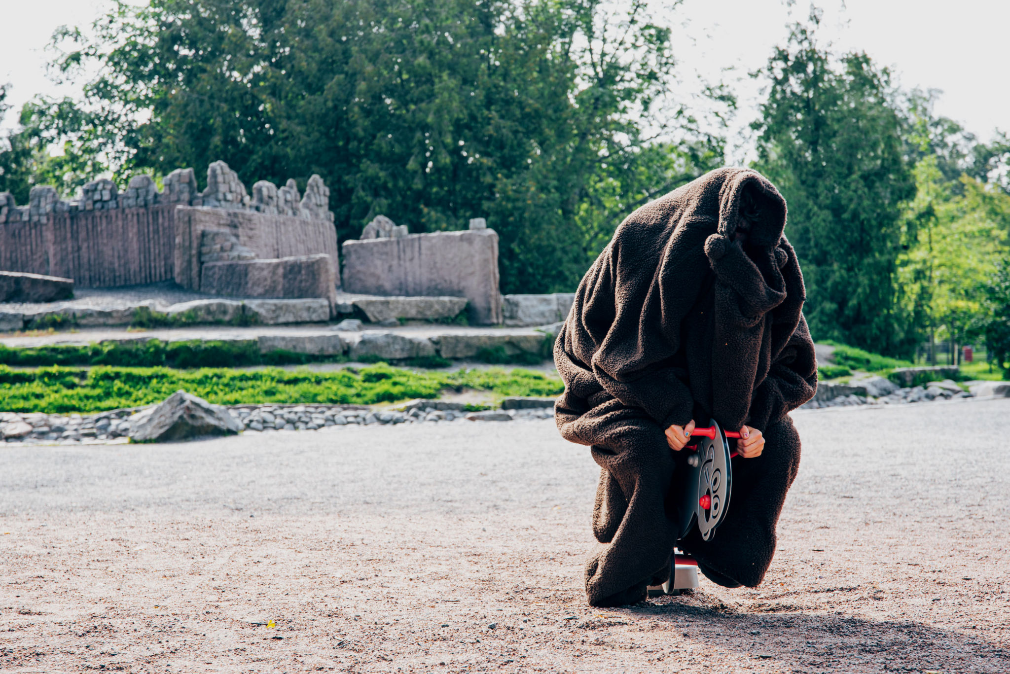 The spell is broken when the artists emerge from the pit, dressed in fur hats and somewhat anachronistic clothes. The creative force is just too strong at the moment, I am both grateful and laughing at the appearance of the fake shamans. The same props will not look funny at all in the installation of the same piece in Taiteen Talo’s gallery, hanging alongside well-recorded, beautifully audible singing voices. Here, appearing in the empty landscape, rising from the crevice between ruralities, these recycled costumes seem too real and too fake, almost offensive, appropriating something from the fake time they have brought back to life: an ancestral witch awakened one too many times; undead, not living, not resting, not able to cast a spell.