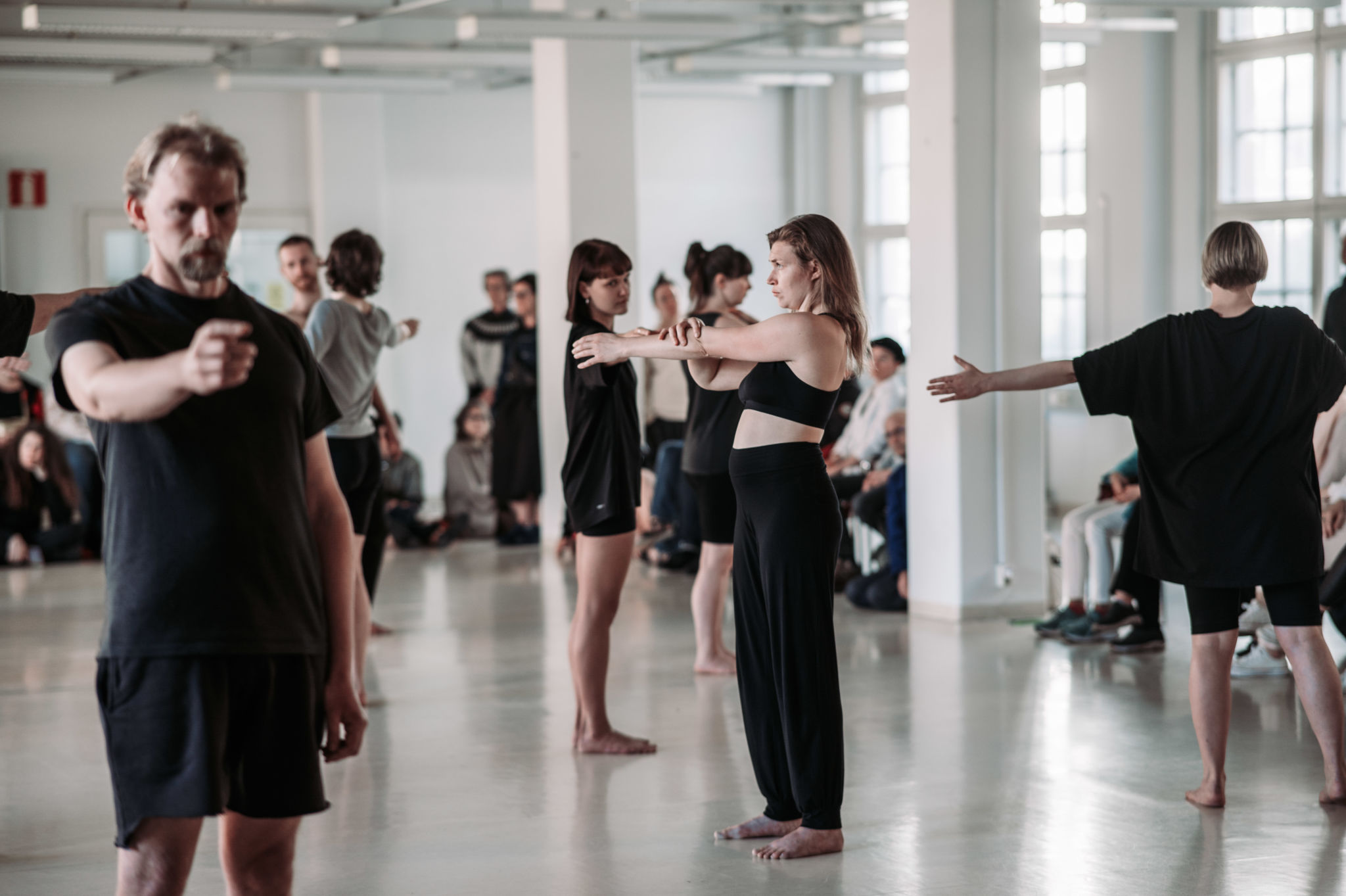 This labourous doing is slow. It feels difficult, both to achieve, I assume, and to watch. It is an act of animating by a singular as well as collective body in a semi-synchronised swarm. It seems like a group of the same doings, in which each member is invested in their own solo version. It also never ends… At some point the audience applauds, there is a shift in the atmosphere of the performance. The audience starts their chattering, yet the performers continue in a semi-performing, semi-aftercare mode of staying together; resting, waiting for something that doesn’t come. Then someone says: “Shhhh….” I shut up and keep watching, but my watching starts to feel as though I’m somehow “arresting” the performers, so I decide to leave.